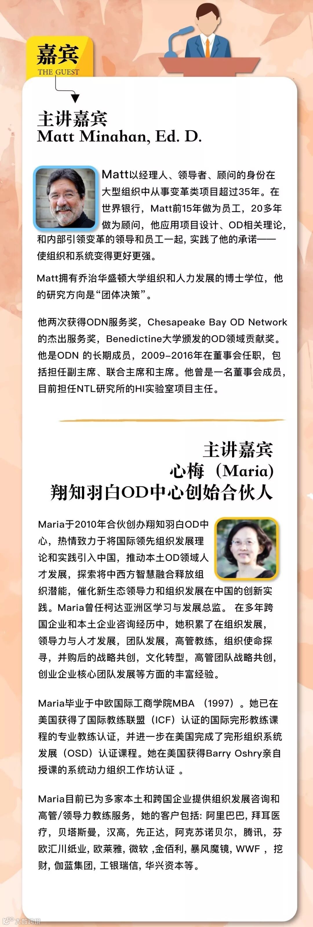 在这个平台上,大家可以在:国际&中国;民企&外企;企业内OD/HR&外部顾问......多方面进行双向的交流和碰撞,“学习与被学习”、“启发与被启发“、“答疑与解惑”......将同时发生。