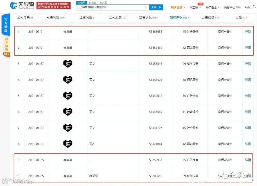 三言财经 2月5日消息,天眼查App显示,近日,上海寻梦信息技术有限公司申请注册“快团团”“群买买”商标,国际分类涉及社会服务、网站服务、广告销售等,商标状态显示为“商标申请中”。