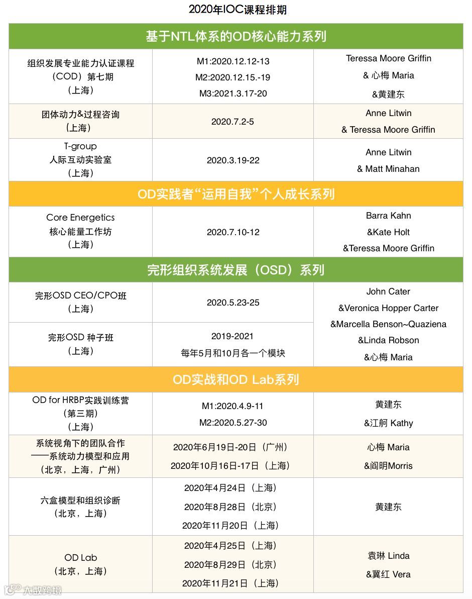 组织发展专业能力认证课程 (COD-Competencies of Organization Development )就是翔知羽白OD中心(IOC)在当今越来越快速变化和不确定性的商业环境下,为培养国内的OD人才/实践者而引进的专业课程。自2015年至今已成功举办五期,也即将在2019年11月迎来第六期课程!前几期我们招收了100多位学员有来自阿里巴巴、惠普、拜耳医疗、阿克苏诺贝尔、礼来、恒生电子、工银瑞信、百词斩、北大纵横、和黄药业、携程、大金、伽蓝集团、敏实集团,达能集团,西部数据等本土及跨国企业的HRD/HRBP, L&D ,OD人士,以及来自各咨询公司的顾问和自由顾问们。