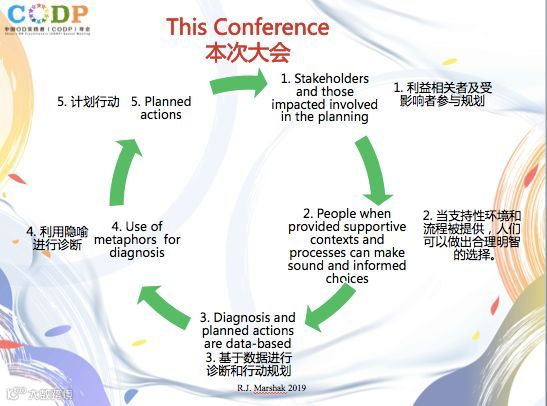 整个设计遵循OD行动研究,年会前DT作为本土OD实践者代表参与规划;年会以Robert J. Marshak博士对OD起源的介绍及Maria关于行动研究及创意的数据收集方式开启 —— 形成小组,运用隐喻做组织挑战的诊断(小组成员立即感知到不同组织的挑战,虽然来自不同企业,发现开启了对话,发现了很多有共性的挑战)—— 每个小组选出了一个最想深入探讨的主题开启Aha实践共创(10个Aha实践主题)—— 分享共创10个Aha实践主题的Practice (针对实践主题共创生成的介入方案)—— 在“OD实践分享集市”上展示、分享和交流 —— Panel分享 —— 现场评选出“最佳OD实践团队共创奖”(从10个Aha实践主题中)——“OD实践调研”,并分享了这一天最大收获的关键词共同看见。