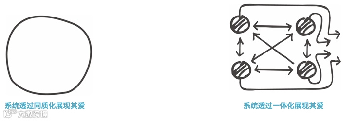 系统依靠整体化与同质化展现其爱。这些都是内在连结的过程,各部分携手合作以实现共同的目标、承担共同的责任、追求系统成员的共性、实现他们的合一。