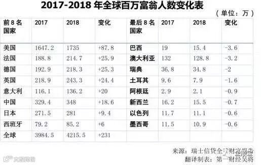 具体来看,2017-2018年中的这一年间,中美两国占据了总财富实际增量的全球前二,且与第三开始的德法英等国家拉开了巨大的差距。美国这一年的增量数据为63,250亿美元,中国则为22,660亿美元。