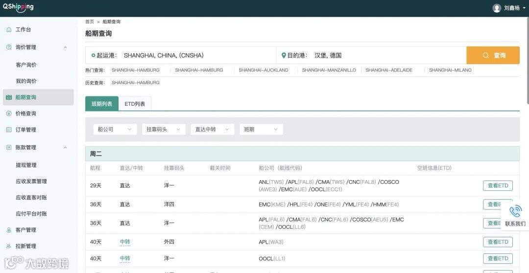 本周QShipping平台上线了“船期查询”功能,各位用户可以更快速地了解各航线的班期和ETD信息啦!