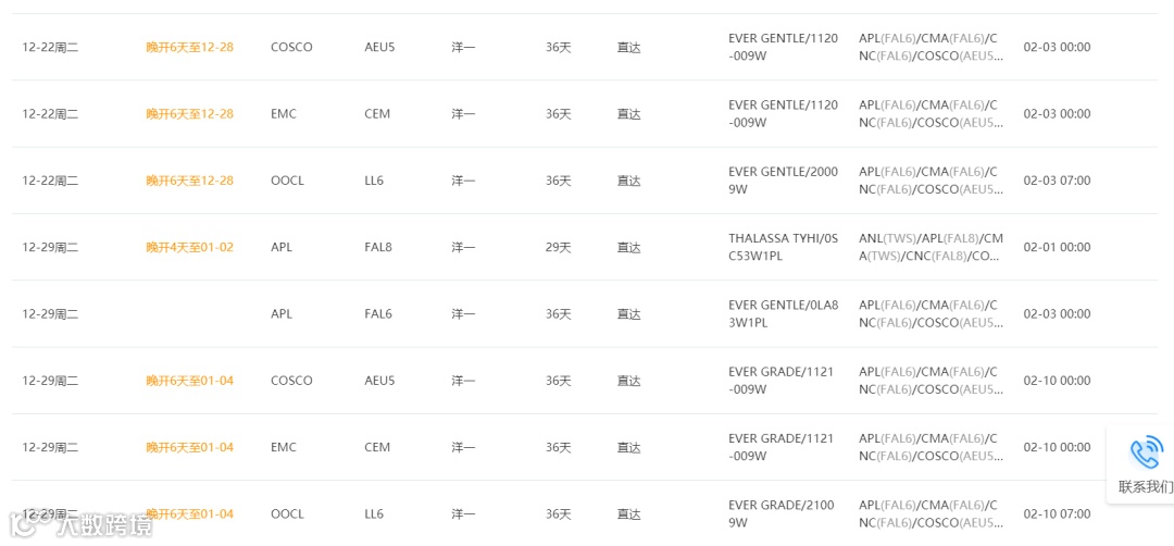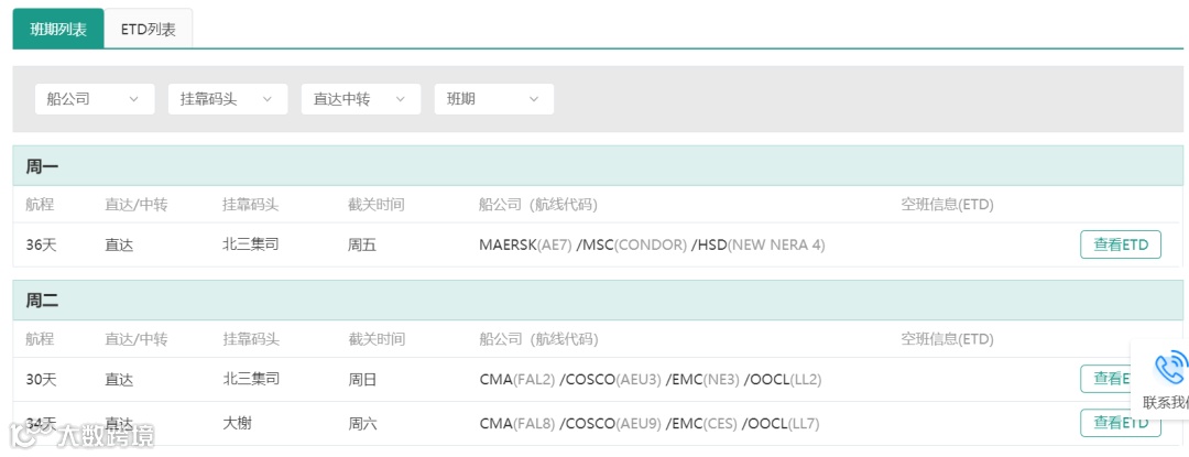 各船公司航线超齐全,航程、直达/中转信息、挂靠码头、截关时间、空班/晚开信息一目了然~