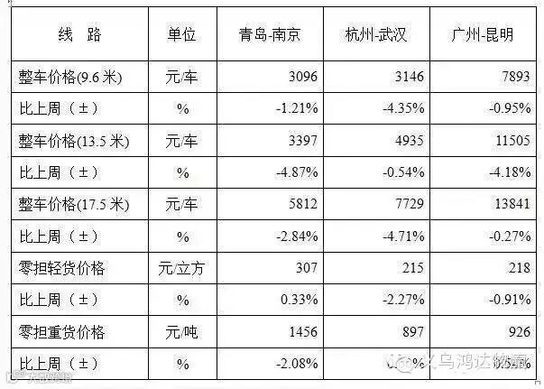 表1 上周部分线路平均价格及环比情况对比
