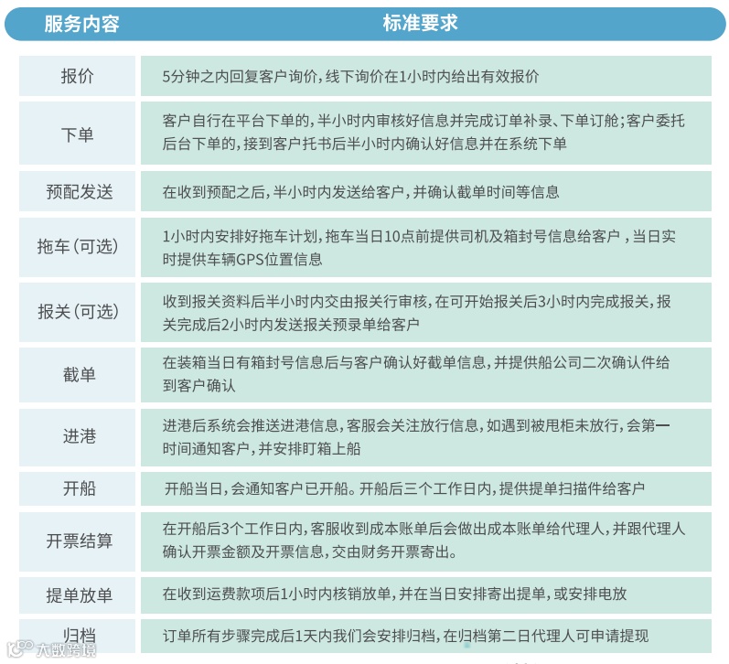 平台详细拆解履约流程各细小环节,严格制定操作和考核标准,将无形的货运代理服务转化成有形的标准化服务产品,并贯彻到全国各个业务点。从询报价到下单、发放预配、截单、装船、开票结算、发放提单,服务品质稳定可控,帮助用户不断稳固和提升客户口碑。以下是QShipping当前的服务标准: