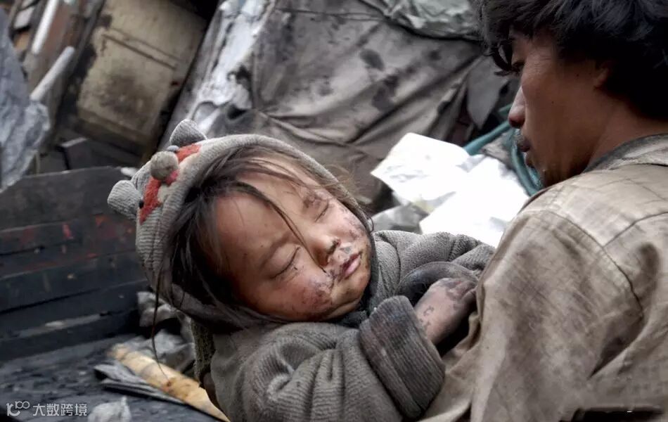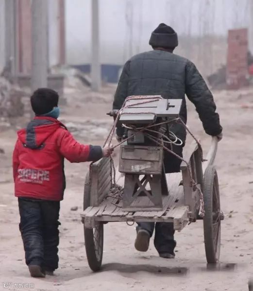 一名小学生帮着父亲推一辆载着重物的木板车,