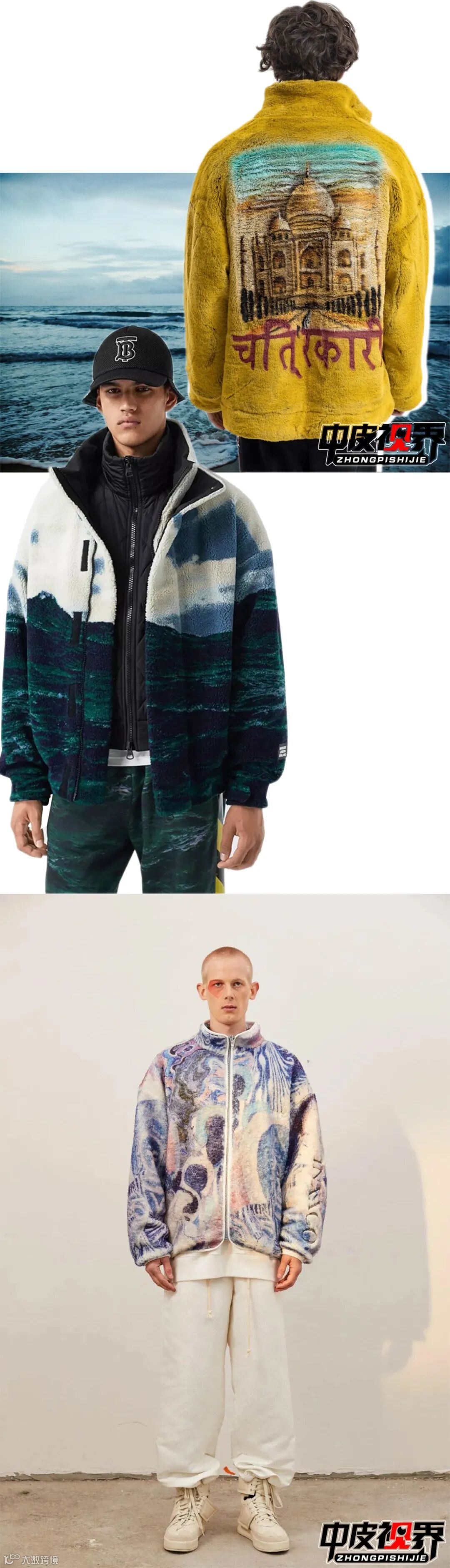 抓绒面料、羊羔毛等绒感材质更新休闲夹克、外套等单品,风景印花图案从视觉上与自然相连。舒适性与温暖质感是该风格的关键要素。