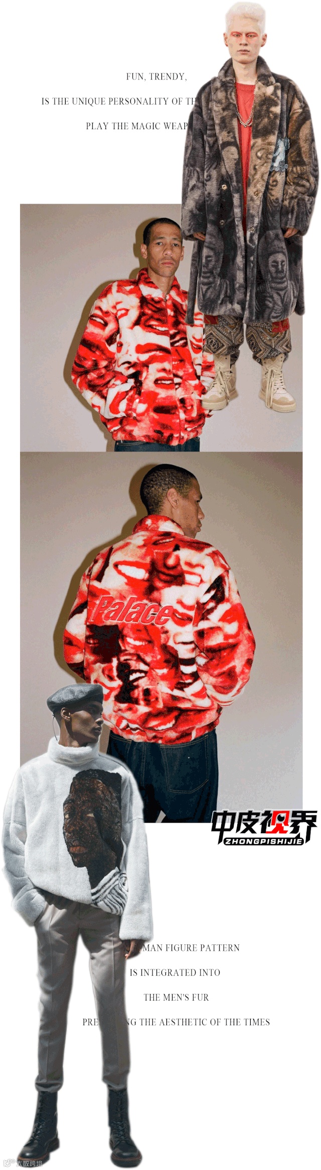 将人像图案融合进男装皮草之中,呈现出时代的审美。趣味,新潮,是年轻人彰显独特个性的扮酷法宝。