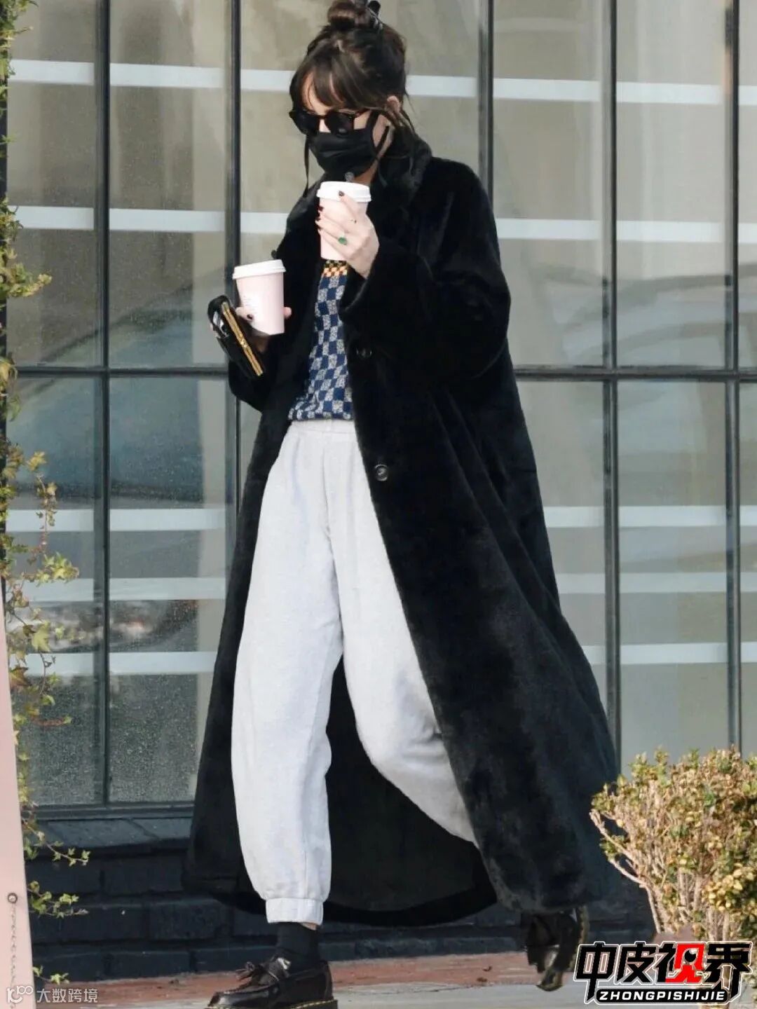 达妹的白色卫裤+英伦牛津鞋搭配长款皮草外套,简单出街look,是不是又保暖又简单又时髦又好学呢?