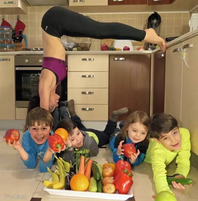 妈妈就在一旁倒立指导他们分类。