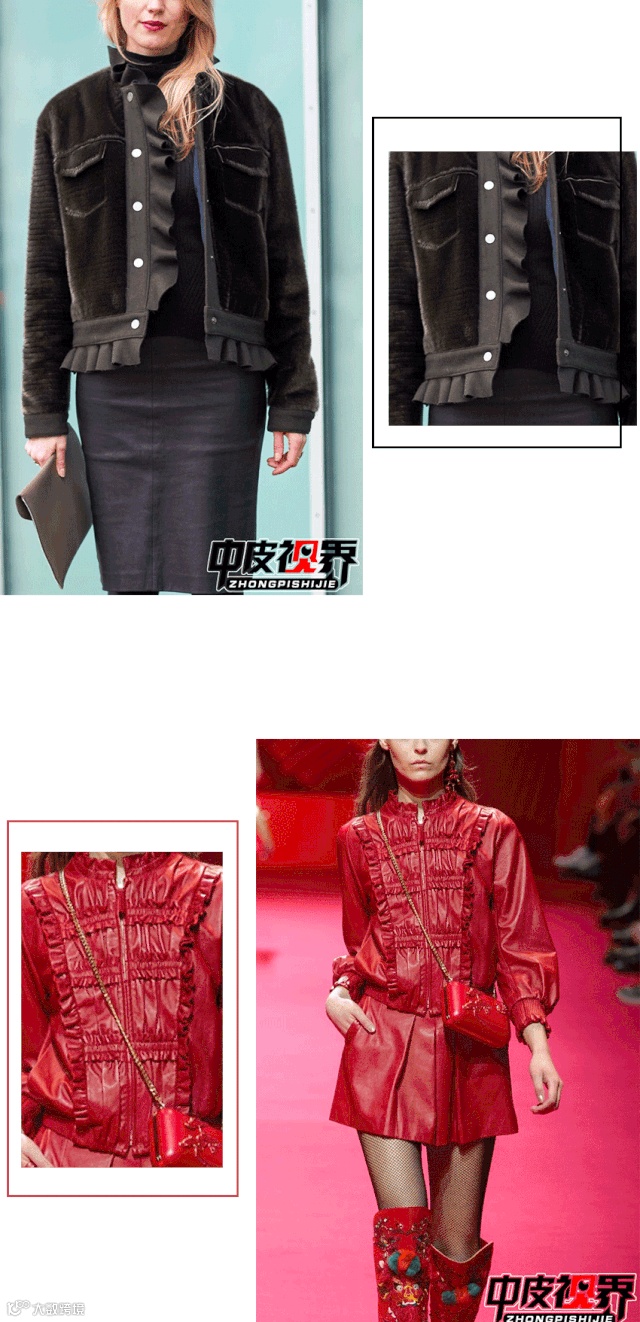 利用这些小细节不仅能够增添服装的层次感、高级感,同时对于一些经典款式也是能将流行元素巧妙运用到皮衣皮草中,比如木耳饰边等。是以,设计师在这方面不断地创新,不断地追逐潮流。