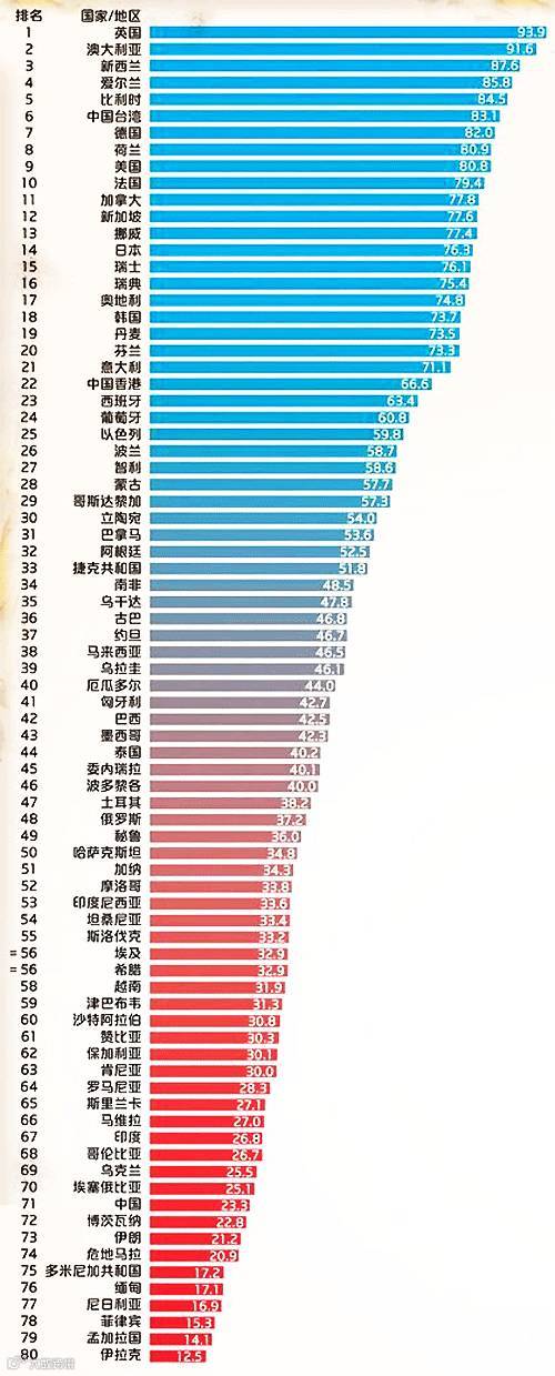 经济学人智库对全球80个国家和地区进行调查后,发布了《2015年度死亡质量指数》报告:英国位居全球第一,中国大陆排名第71。