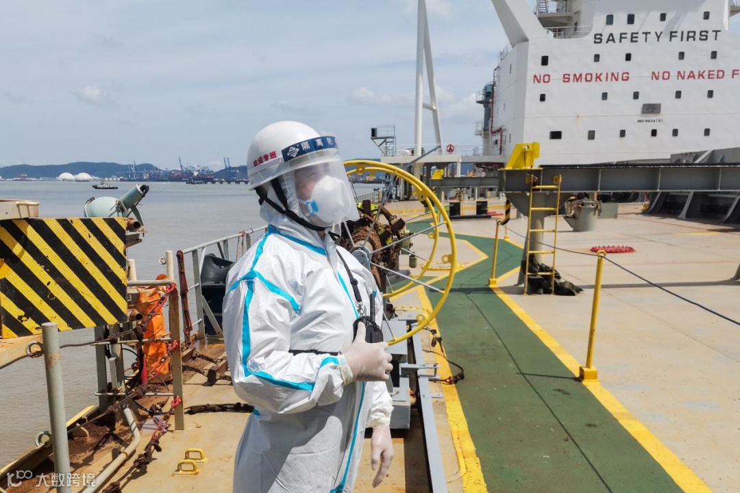 4月7日,“扎尼”轮缓缓贴近轮司大榭实华原油码头,防疫专班第一小组组长兼网格长徐寅良和组员们早已“全副武装”等候在平台准备带缆。他们对缆绳的琵琶头仔细喷洒消毒剂后,通过绞盘缓缓将千斤重的缆绳带到码头平台的脱缆钩上。“大家看看各环节都到位了没?消毒一定要彻底,防护一定要做好。”徐寅良不厌其烦地强调着防疫工作的重要性。随后,搭梯、接臂、开泵……等到外轮开始接卸,夜幕已悄然降临。