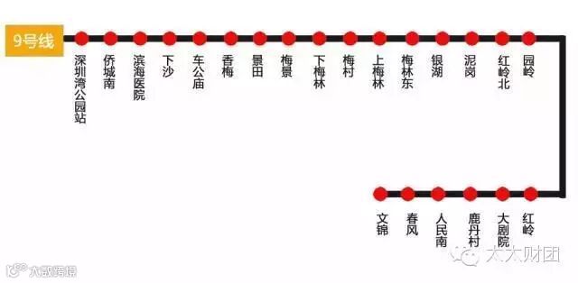 9号线: 9号线可谓是四通八达,22座车站,10座换乘站。连接深圳湾休闲长廊,休闲观光,通往未来CBD ,上班下班!横贯梅林片区,远离堵车!