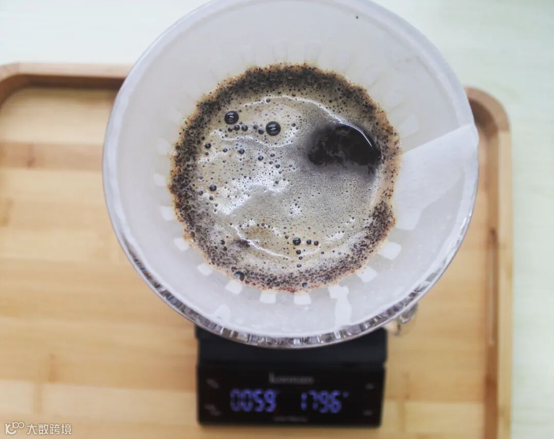 注水。依旧从中间向外划圈,注入热水(这个阶段会有大量泡沫产生,香气也愈加浓烈),直到秤面显示288字样,拿开滤杯,一壶手冲咖啡萃取完毕。整个过程不能超过3分钟。