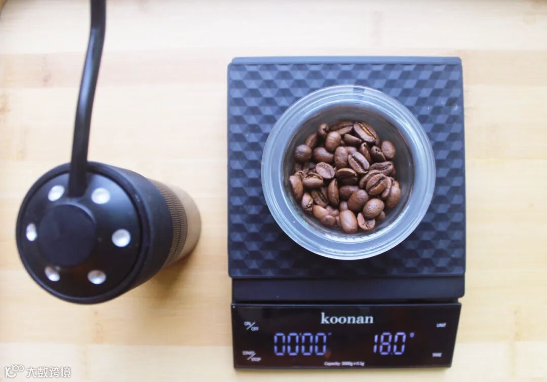 取适量的咖啡豆,用手磨机磨成咖啡粉。一般认为手冲所需的咖啡粉的研磨度类似砂糖般的粗细为宜。不同豆子和机子有不同的研磨度,在这个过程中能体会到减压的快乐~