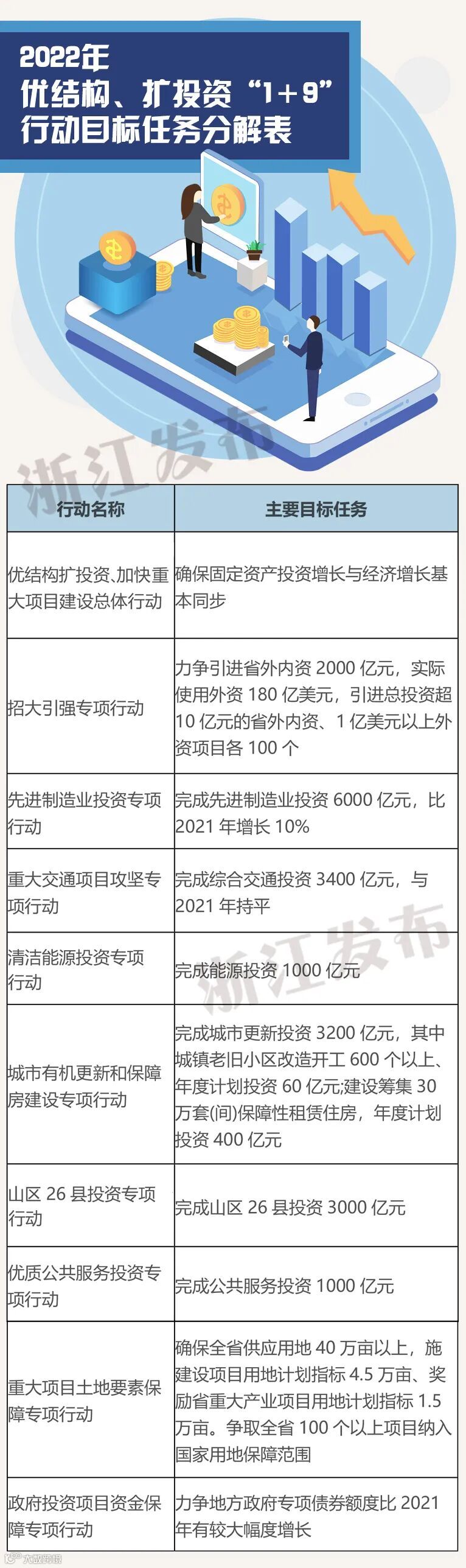 《计划》明确,浙江将以重大项目建设为抓手,着力扩大有效投资、优化投资结构、提高投资效益,扎实推进优结构、扩投资“1+9”行动,奋力交出扩大有效投资的高分答卷。