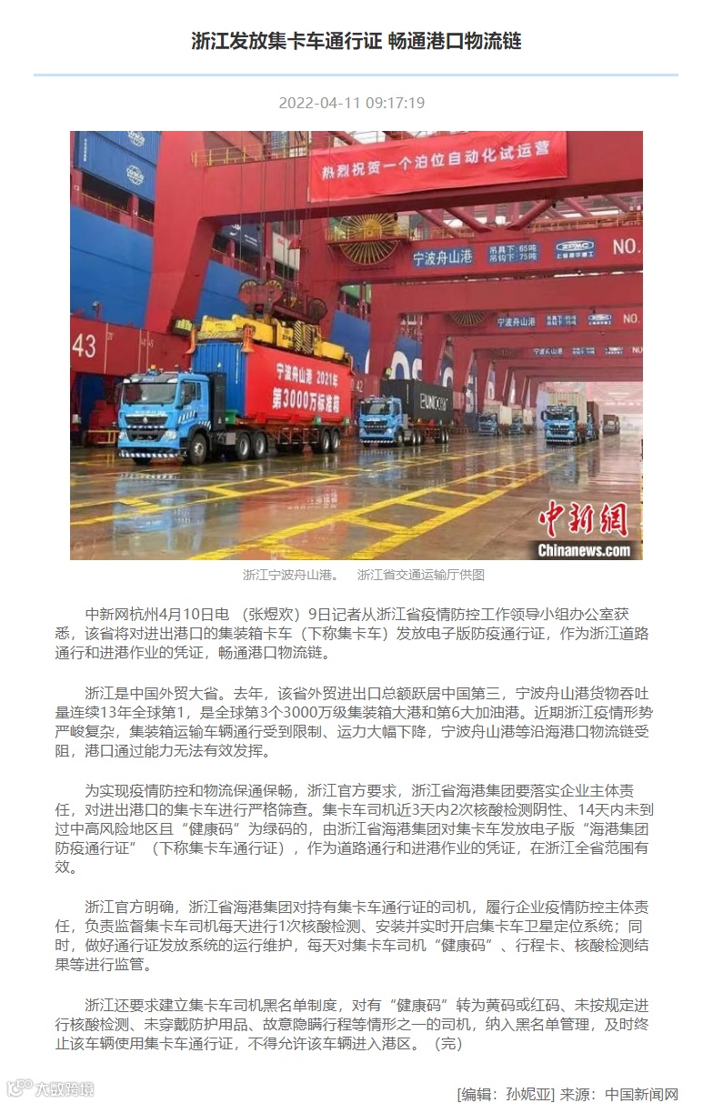 4月12日中午,CCTV-2播发新闻《浙江:为集装箱卡车发放防疫通行证 畅通港口物流》,对浙江省海港集团、宁波舟山港集团落实企业主体责任,对符合要求的车辆发放电子版防疫通行证,畅通港口物流进行了报道。具体内容请点击视频: