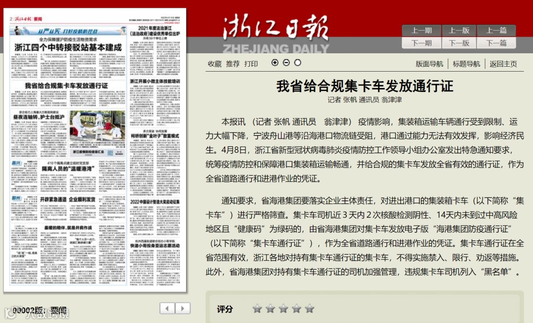 此外,中国新闻网、CNR中国之声、浙江日报、中国蓝新闻、中国水运报等媒体也在近日纷纷聚焦宁波舟山港以数字赋能精准智控,多措并举织密集卡防疫网络,全力保障物流链供应链畅通稳定等举措和成果。