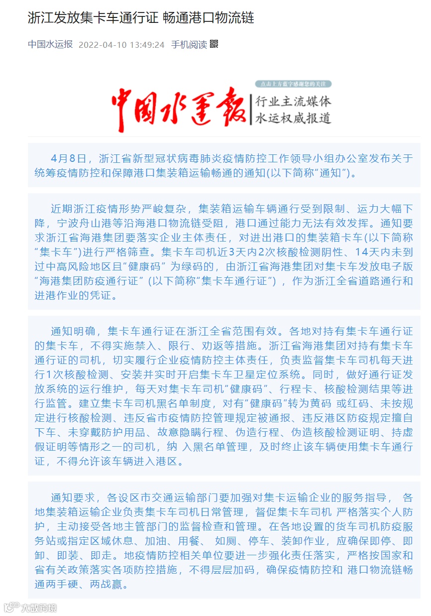 浙江发放集卡车通行证 畅通港口物流链