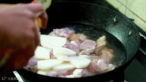 羊肉冷水下锅焯水,加点料酒、白萝卜片