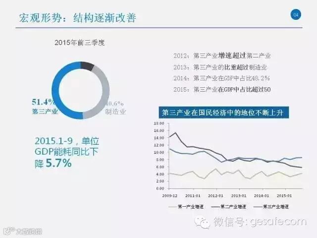 第二,关于增长结构。其实从整个宏观经济发展结构变化来看,从 2012 年开始改善的势头就已经出现了端倪,2012 年第三产业的增长速度第一次超过了第二产业。