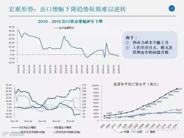大家看到下方这张图,目前中国劳动力综合成本是印度和越南的三倍以上。这五年来我们出口加工产业,也就是说劳动密集型的产业始终在转移,大量中国的劳动密集型产业转移到印度和越南去了。从这么大的劳动力成本的差距大家就可以看出来这种转移是很难逆转的。