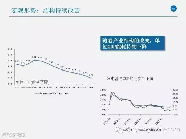 所以说过去五年里边我们的经济是以速度换质量的过程。大家看一下表中这两张图,2006 年的时候单位 GDP 煤耗超过 1,到了去年是 0.7,今年已经破了 0.7,光煤这一项下调了 30%。大家也看到发电量和 GDP 增长背离。煤耗的下降和发电量的背离,都说明我们经济增长的模式实际上在悄悄的转变。