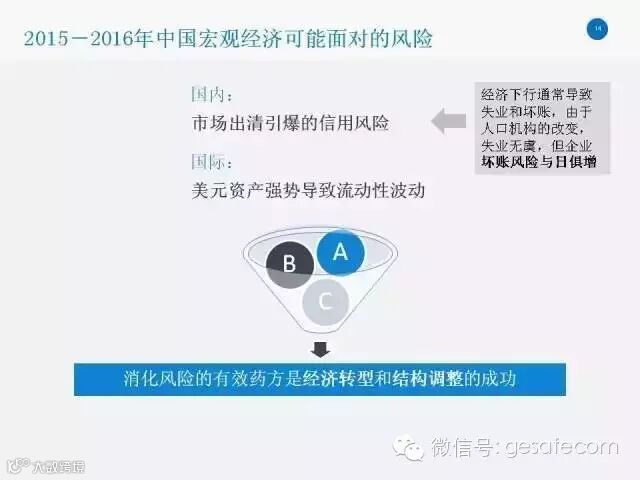 最后说一下中国经济在最近一年可能会面临哪些风险。我认为有两个风险,一是经济总量增长速度的下行带来的信用风险。通常来说经济下行带来失业和坏帐,在中国失业的问题不用担心,但是坏帐的问题已经在各个银行备付金里边体现出来了,接下来会在信用债的违约里边继续体现出来。第二个是美元资产的强势可能会导致资产外流的压力。这就是中国经济未来五年可能面临的风险。规避这些风险的要点我认为不是宽松和增长,而是经济转型的调整,这才是经济发展最主要的药方。我的演讲到这里为止。谢谢各位!