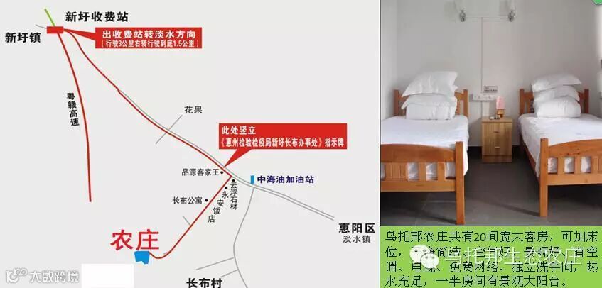 地址:深惠交界—惠州新圩镇长布村;高德或百度或手机导航:乌托邦农庄,或导航:长布公寓;凯立德K码导航:8y8-j80-hbg。
