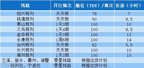 目前省内的海铁联运线路已经遍布除舟山、温州、嘉兴以外的其他所有地级市!其中义乌已做到1天4班,金华、萧山已做到1天3班。