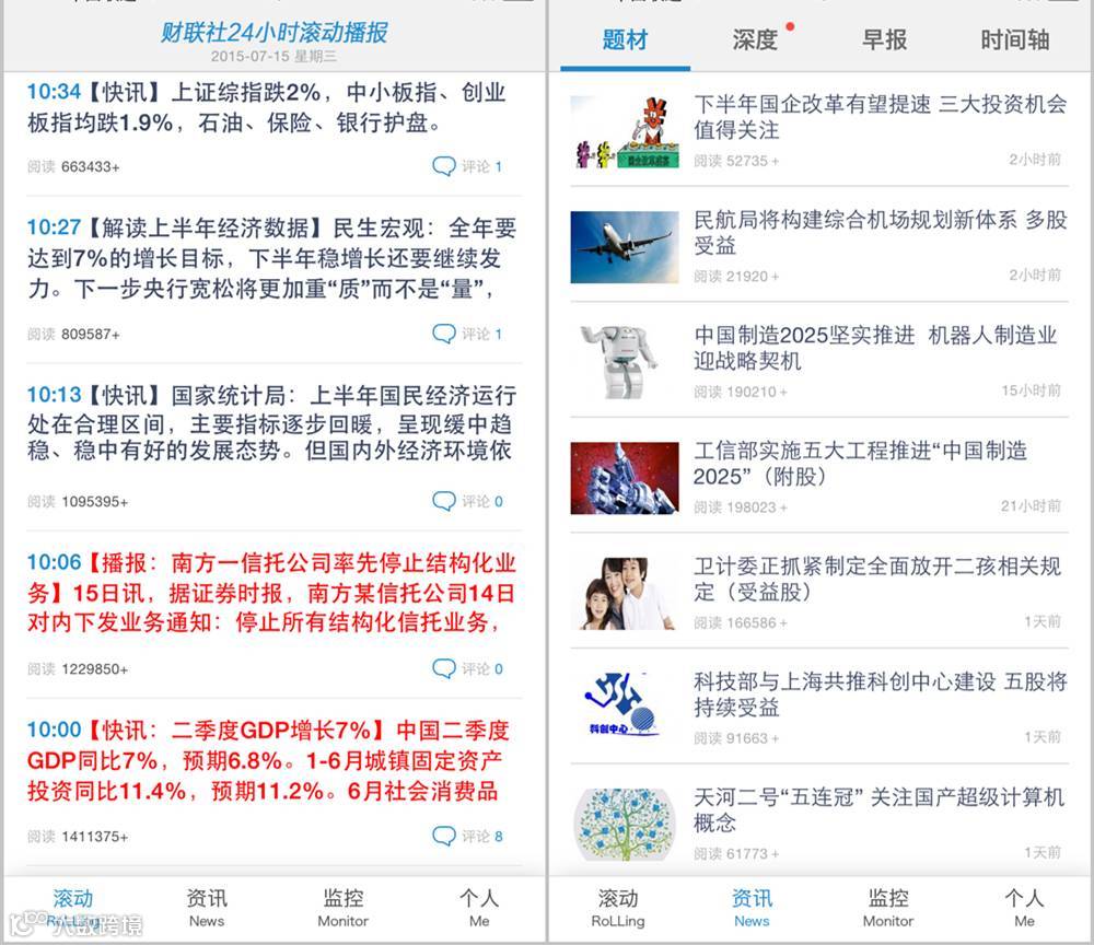 股市动荡的时候,消息总是特别多,但也很杂。微信群、QQ群、贴吧里头充斥着各种“转”“传”“据说”“求证”……等等的消息,让人看得头晕。这种时候,“财联社”APP就非常好用。它清晰、快速、全面有条不紊地播报着,每一个股市政策、动态。