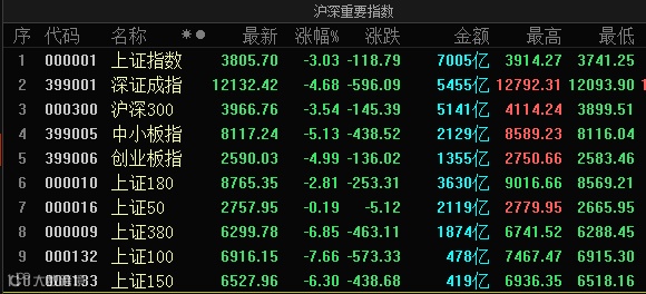 今日(7月15日)A股再度杀跌,沪指重挫逾3%险守3800点关口,板块近乎全线下挫,“两桶油”、银行股强撑护盘,两市再现千股跌停。截至收盘,沪指跌3.03%报3805.70点,成交7005亿元;深成指跌4.68%报12132.42点,成交5455亿元。