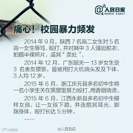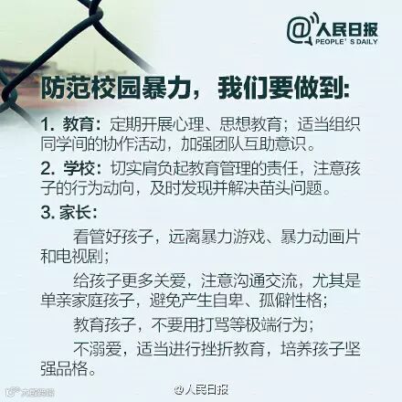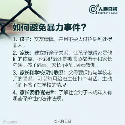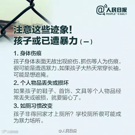 22日,“江西永新女初中生打架”视频疯传,多名初中模样女孩,让一女孩下跪,并扇耳光、踹身体,殴打长达5分钟。近年,多地发生校园暴力。你知道哪些迹象显示孩子可能遭遇暴力?遭遇暴力,孩子应该怎么办?防范校园暴力,家长能做些什么?戳图↓↓
