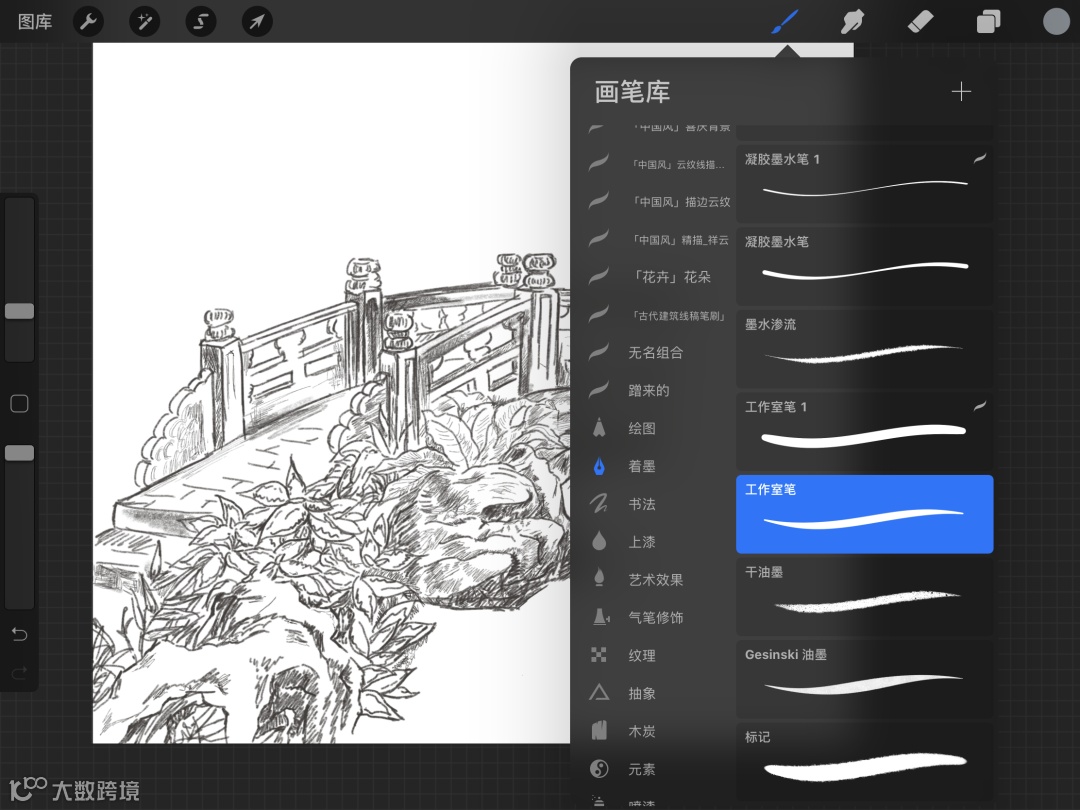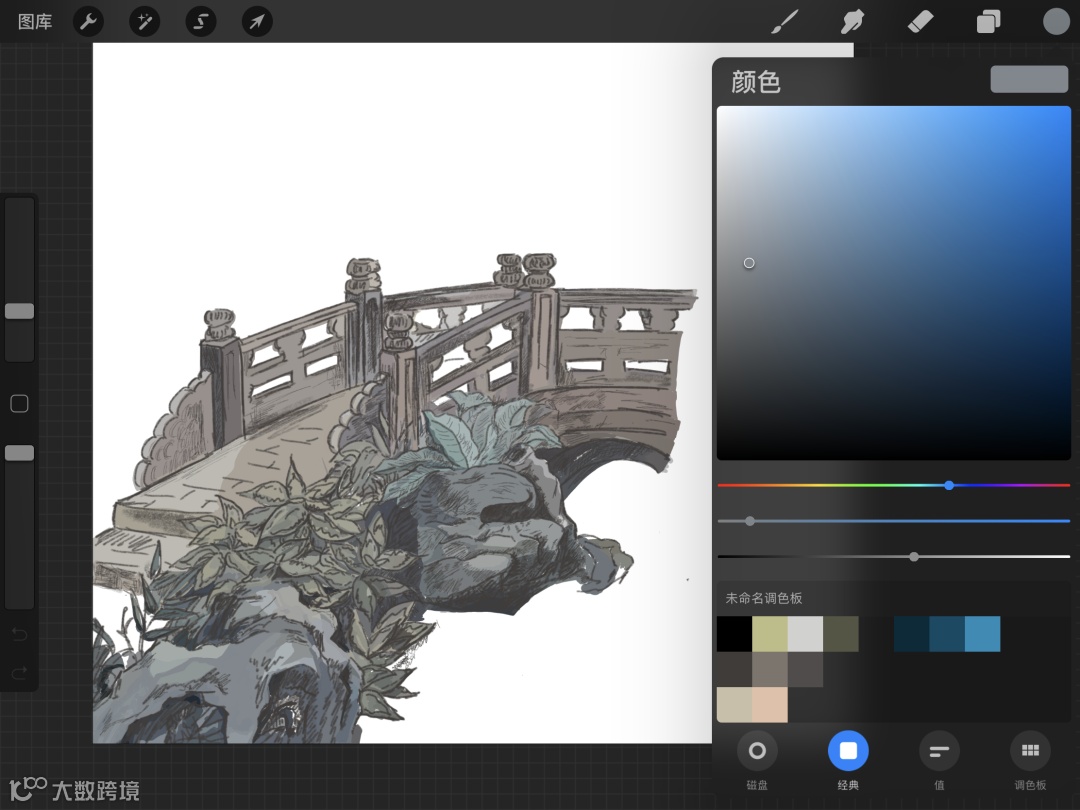 我常用的绘画工具是ipad。首先,打开常用的绘图软件,用简单的线条勾勒出桥的主体。线稿按照画面内容不同,以前景中景后景的方式分图层绘画,方便后期更改线稿的颜色。