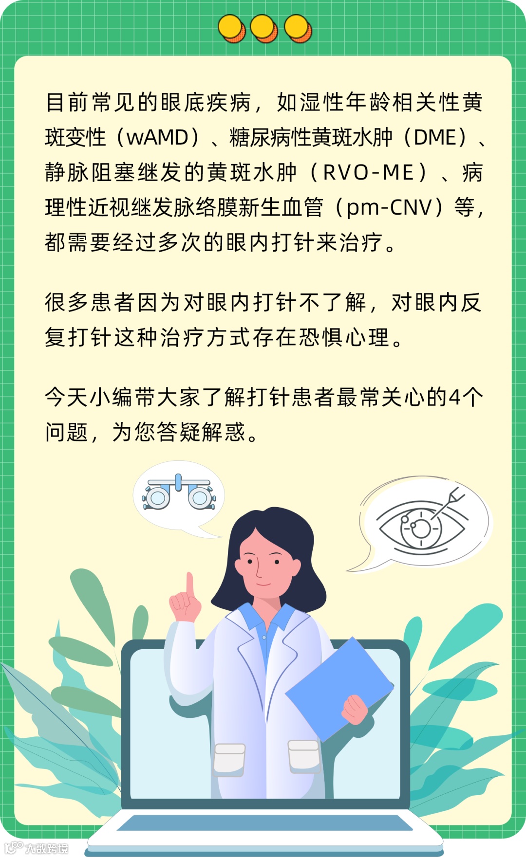 2.抗VEGF药物注射过程中患者基本感觉不到疼痛。眼内打针的手术过程非常安全,仅有短暂的眼压升高,注射部位极少量出血这种轻微并发症,但是很快就可以恢复。