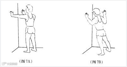 患者面对墙角笔直的站立,同时双脚要与肩膀等宽,双手平肩支撑两面的墙上,同时在深呼吸。接下来肩膀慢慢向前伸展,同时还要舒缓头部和上背,这样坚持五秒钟之后再恢复原位,每天重复五次即可