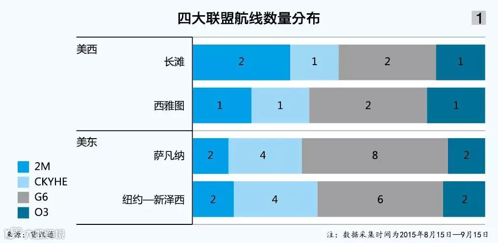 货讯通共分析了四大联盟的26 条服务航线,其中每条航线至少挂靠长滩港、西雅图港、萨凡纳港、纽约—新泽西港港4港之一。如图 1 所示,在西岸长滩和西雅图港,各联盟的服务航线分布数量大抵相同,每个联盟都运营了一至两条航线。然而,在东岸两个港口的航线分布上,G6 联盟运营的航线数量是其他联盟的 2 至 4 倍。