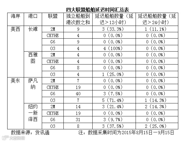 货讯通分析了 2015 年 8 月 15 日至 9 月 15 日期间,各联盟在 4 个港口的船舶到港情况。通过分析船期数据,以及比较船舶的实际到港时间和承运人公布的预计到港时间,发现这4个港口一共发生了191次独立的船舶到港。平均来说,所有船舶到港次数中有13%出现延迟超过12小时;只有3%的延迟是超过24小时。