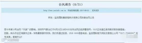 今日上午11时,深圳盐田国际集装箱码头也发布了防御台风公告,表示码头正依据应急预案采取防御措施,目前码头作业一切正常。可以预见,随着台风进一步逼近,码头方将进一步出台更高级别的警报,届时有可能影响正常的提还柜,因此,还请大家早做准备。
