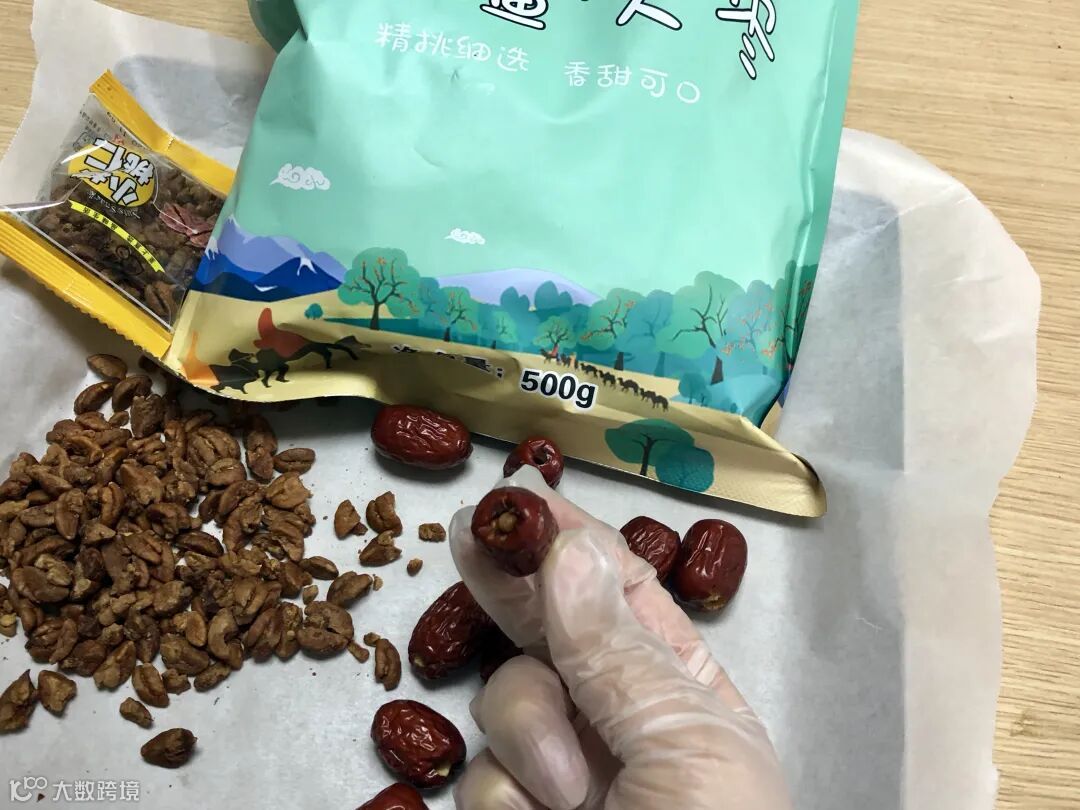 红枣去核后塞入坚果仁。