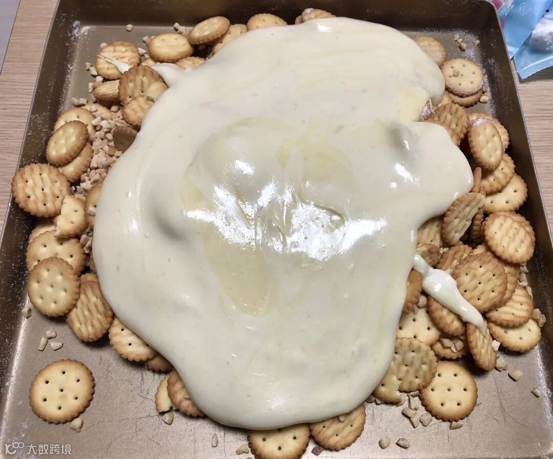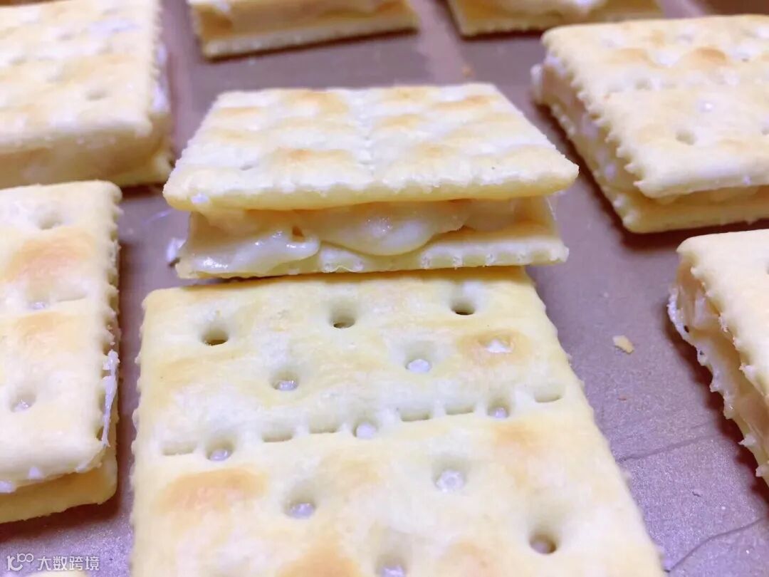 放一勺牛轧乳在一片饼干中间,再盖上另一片即可。
