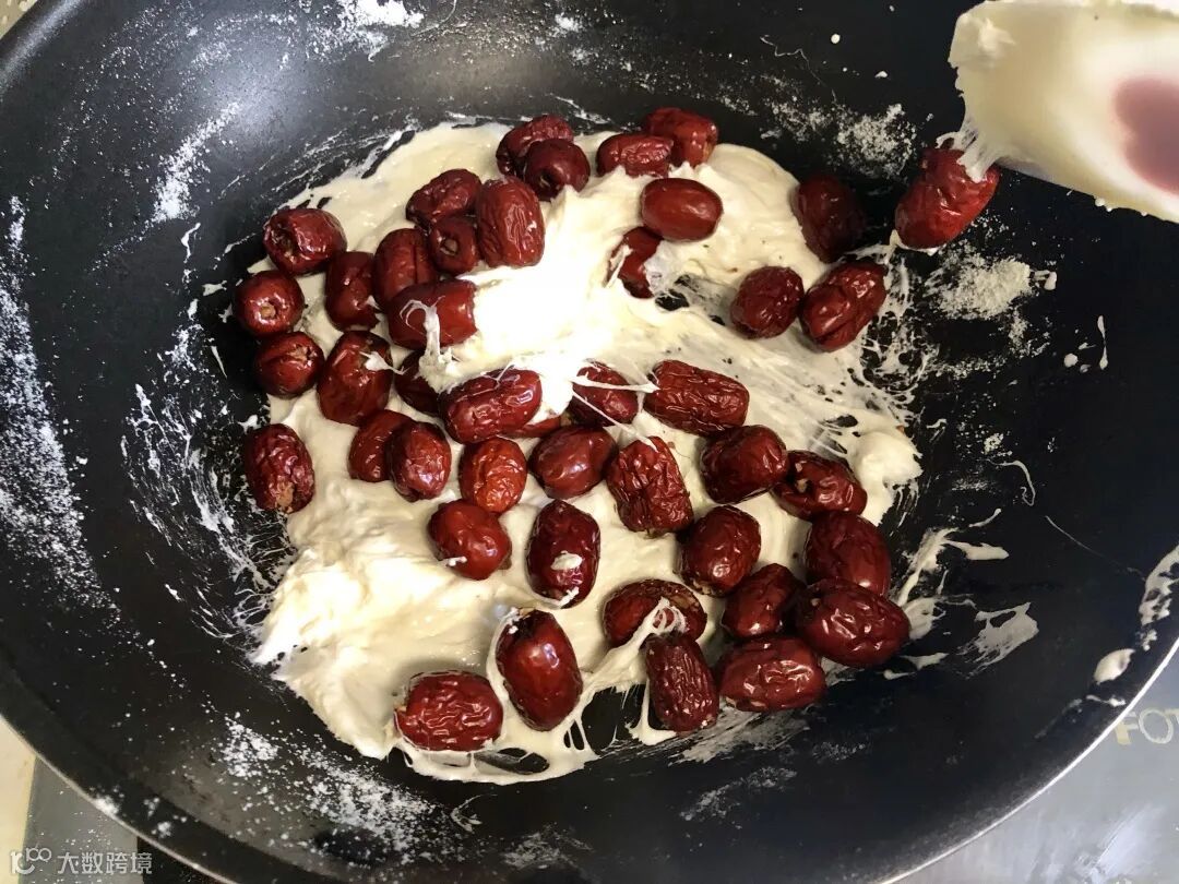 牛轧乳中加入红枣后搅拌均匀。
