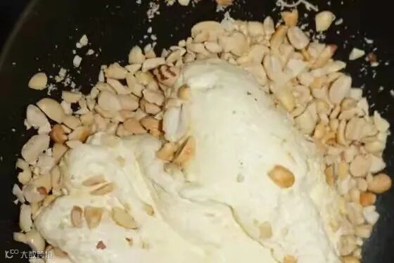 将花生碎(或其它坚果仁)加入牛轧乳。