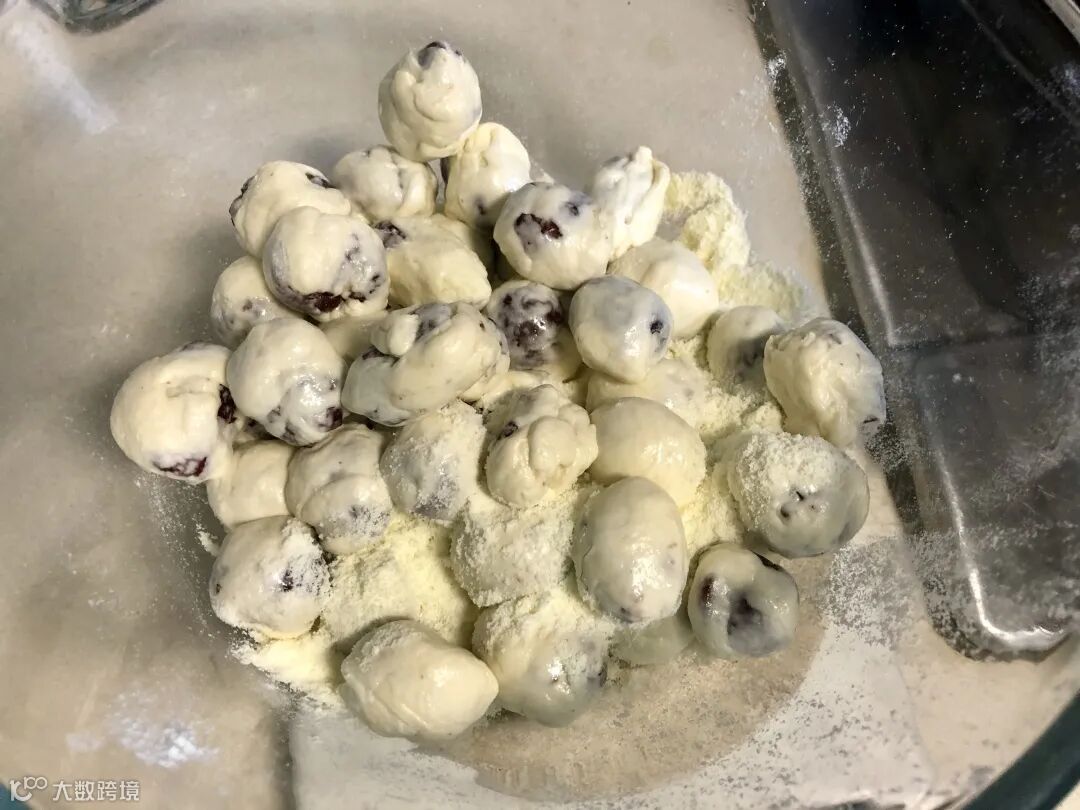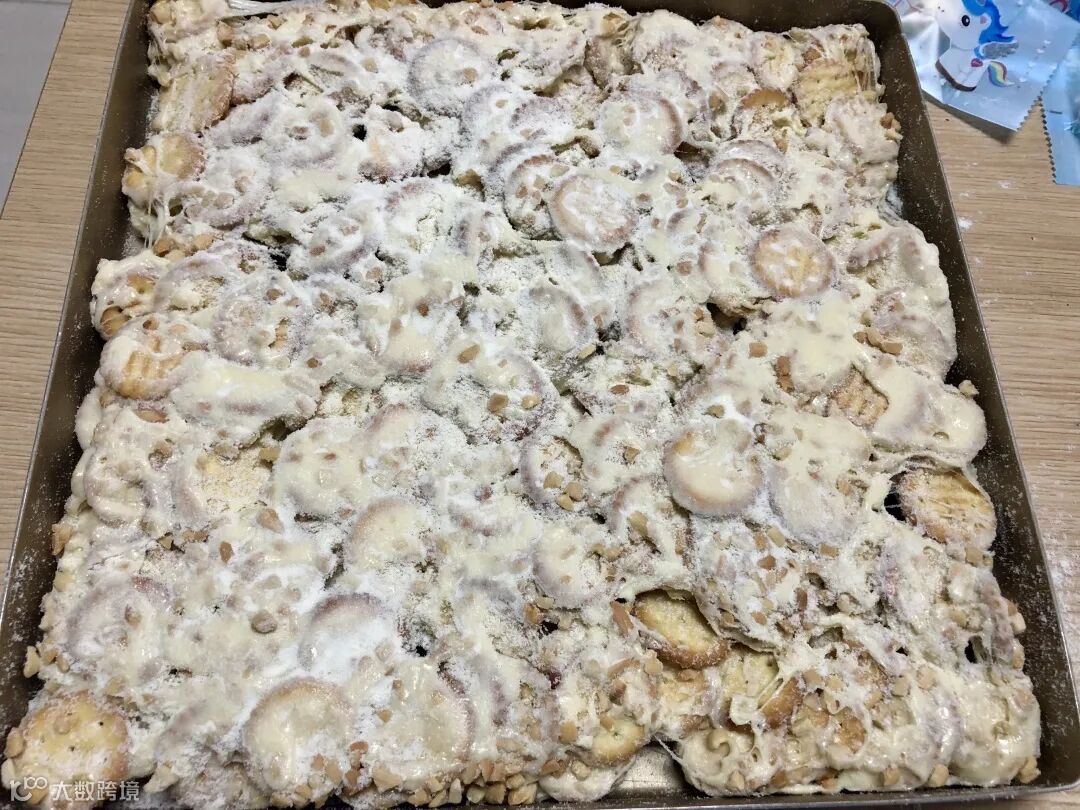 在模具里按压平整,并在表面撒上奶粉,翻面后再撒上一层奶粉。