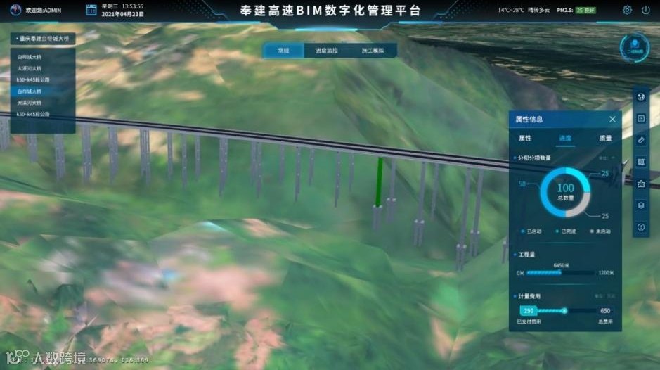 此次申报的项目依托于大溪河特大桥工程,项目地处三峡库区,地势险峻,施工难度大。华建数创作为数字化服务单位,全程参与了项目的数字化建设。成功地将数字技术和实际工程相结合,通过精细化BIM、普及化BIM等数字化创新理念,结合BIM+智能建造技术实现项目数字化建设、管理及监测预警,并将物理资产和数字模型相融合,形成智慧高速全要素的数字底座。