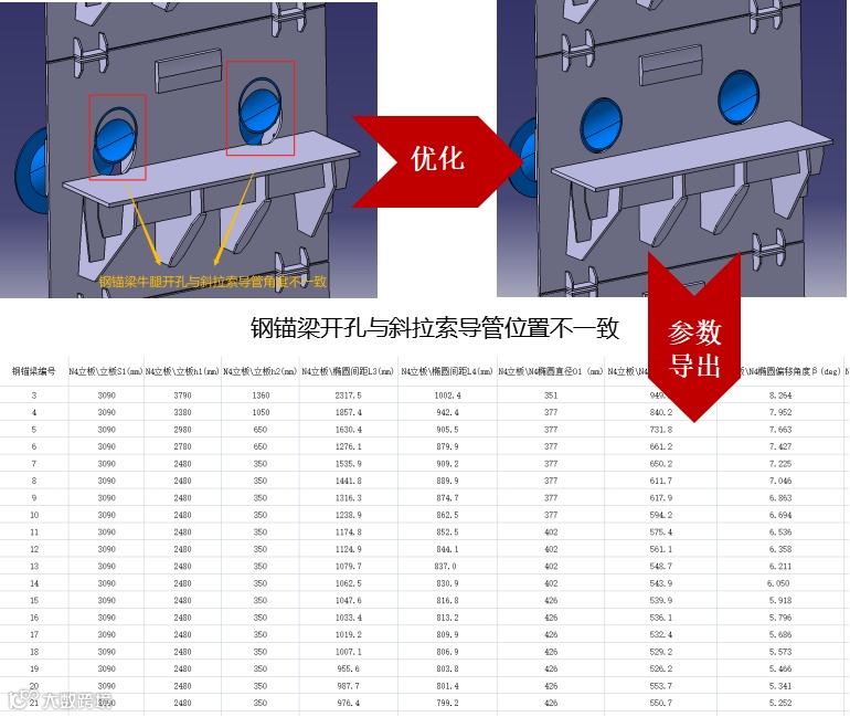 对钢锚梁及斜拉索导管进行提前预拼,将开孔位置、角度、大小等运用模型进行精细分析,对不合理的数据进行优化后,导出相应的尺寸、开孔直径、角度等参数数据,提前解决设计数据偏差问题,辅助构件加工生产。