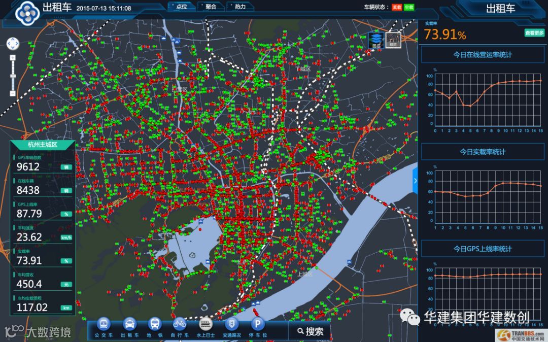 城市交通:出租车、公交车、公交自行车、停车场地铁均可视化展示。如下图,可综合展示城市交通中出租车的实时点位、聚合、热力图及各类统计信息。图中为出租车点位图,车辆总数、在线车辆、上线率、实载率、平均速度等统计信息,以及在线营运率、实载率、上线率的统计曲线。