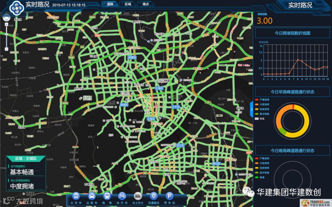 交通路网与服务:综合展示城市交通中道路、区域路况、堵点及各类统计信息,点击道路可查看该道路的基本信息及拥堵信息。图中为道路拥堵实时路况、全市拥堵指数,以及今日拥堵折线图、早晚高峰道路通行状态圆环图。